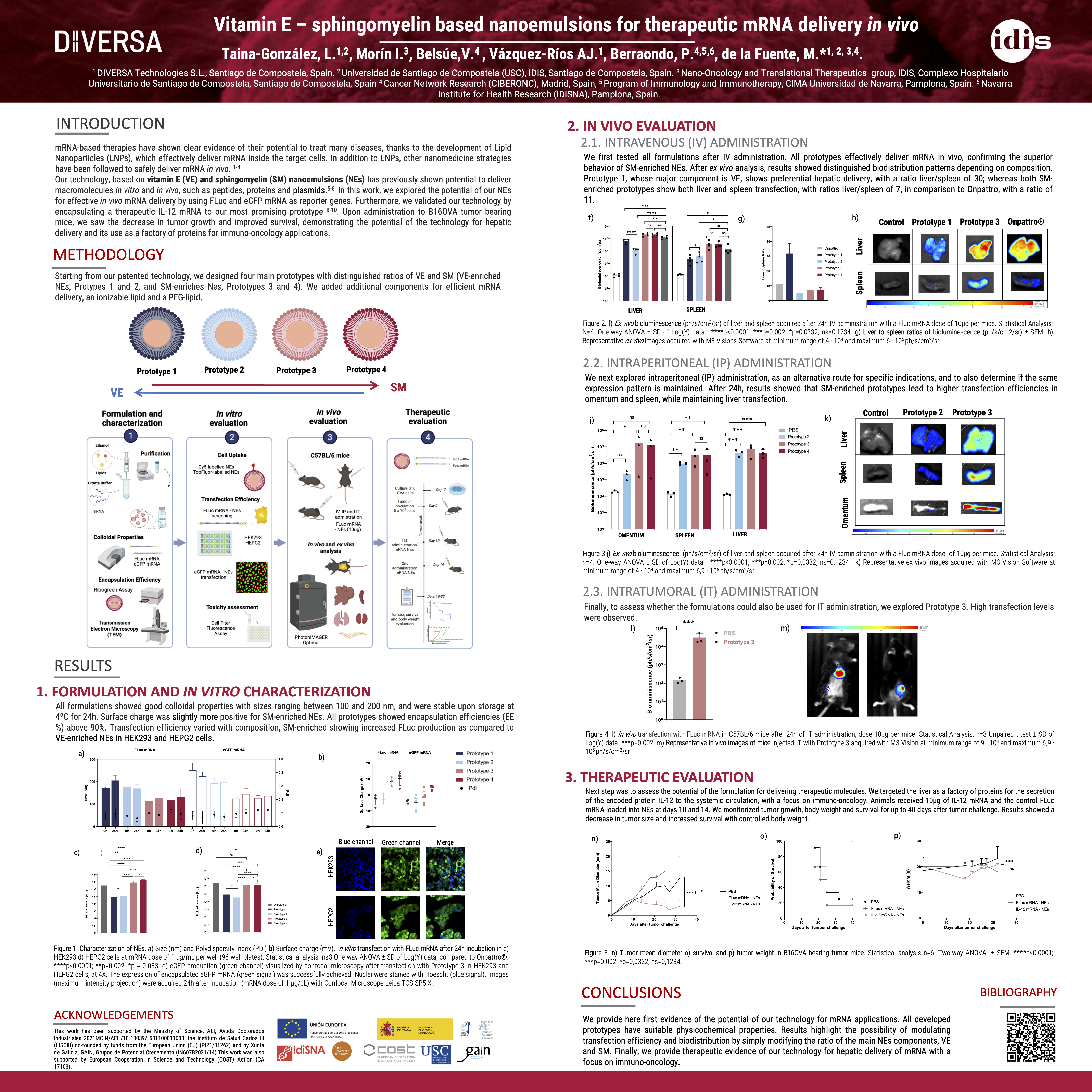 In the framework of Laura Taina’s Industrial PhD, we have proved the potential of our technology to deliver therapeutic mRNA encoding an interleukin with anticancer activity before and interfere tumor growth. This work has recently been presented in the biggest event in drug delivery and nanomedicine, the Controlled Release Society Annual Meeting, Laura Taina being awardee of a competitive travel grant to attend.